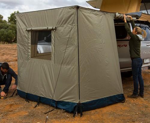 La parete destra presenta una sezione della porta con cerniera che può essere arrotolata per un facile accesso, la parte posteriore non chiusa consente il pieno accesso al veicolo.